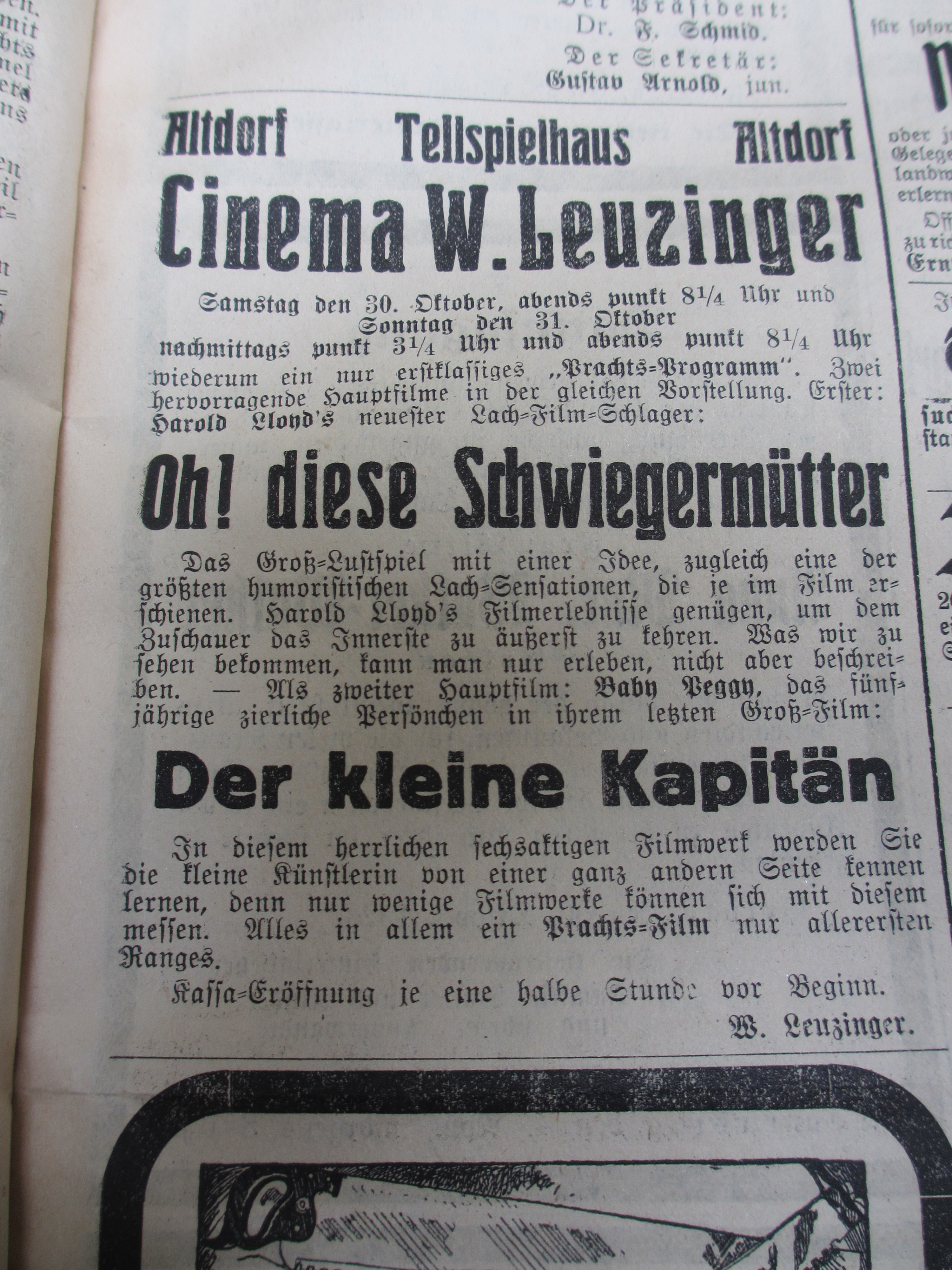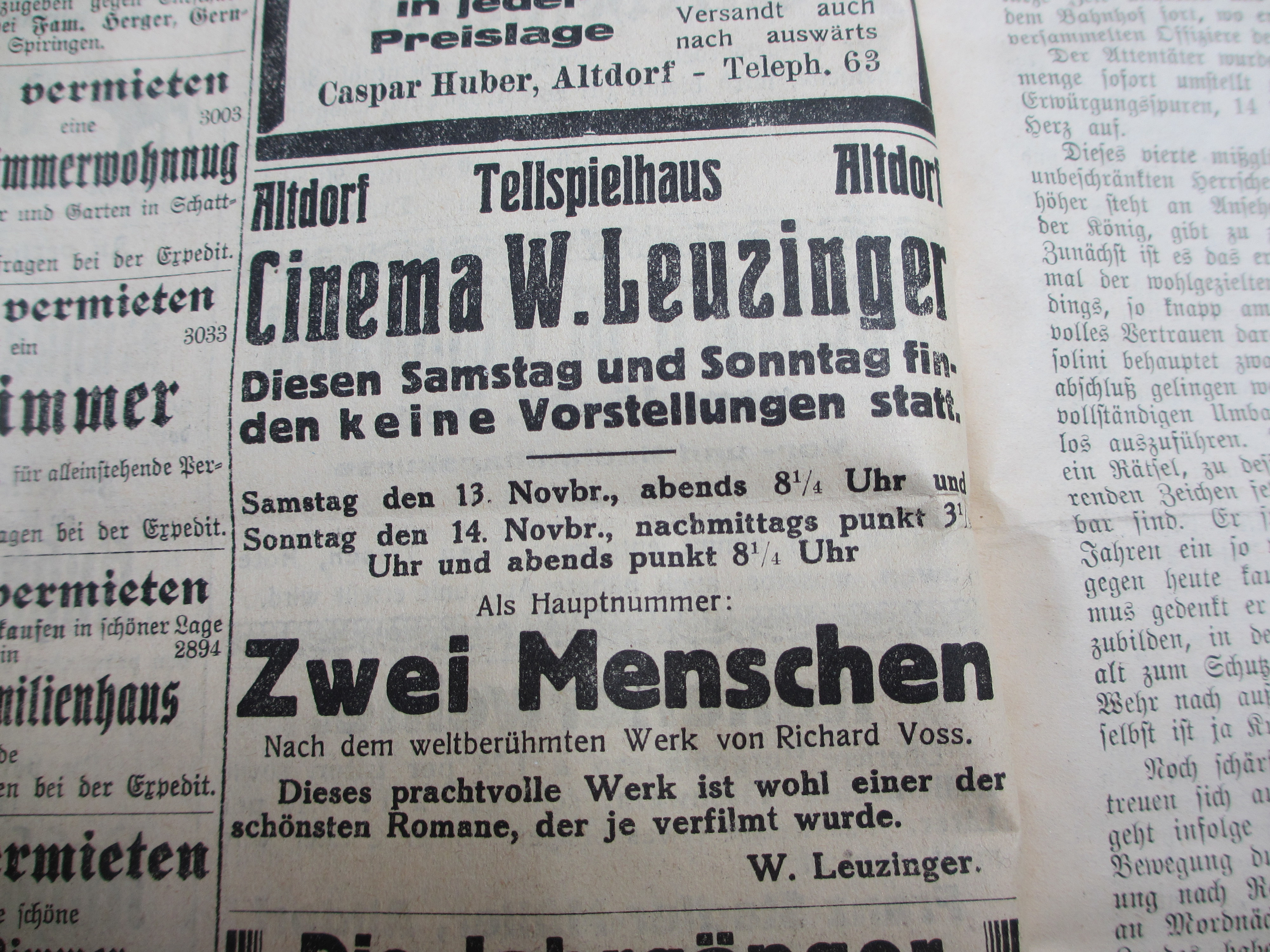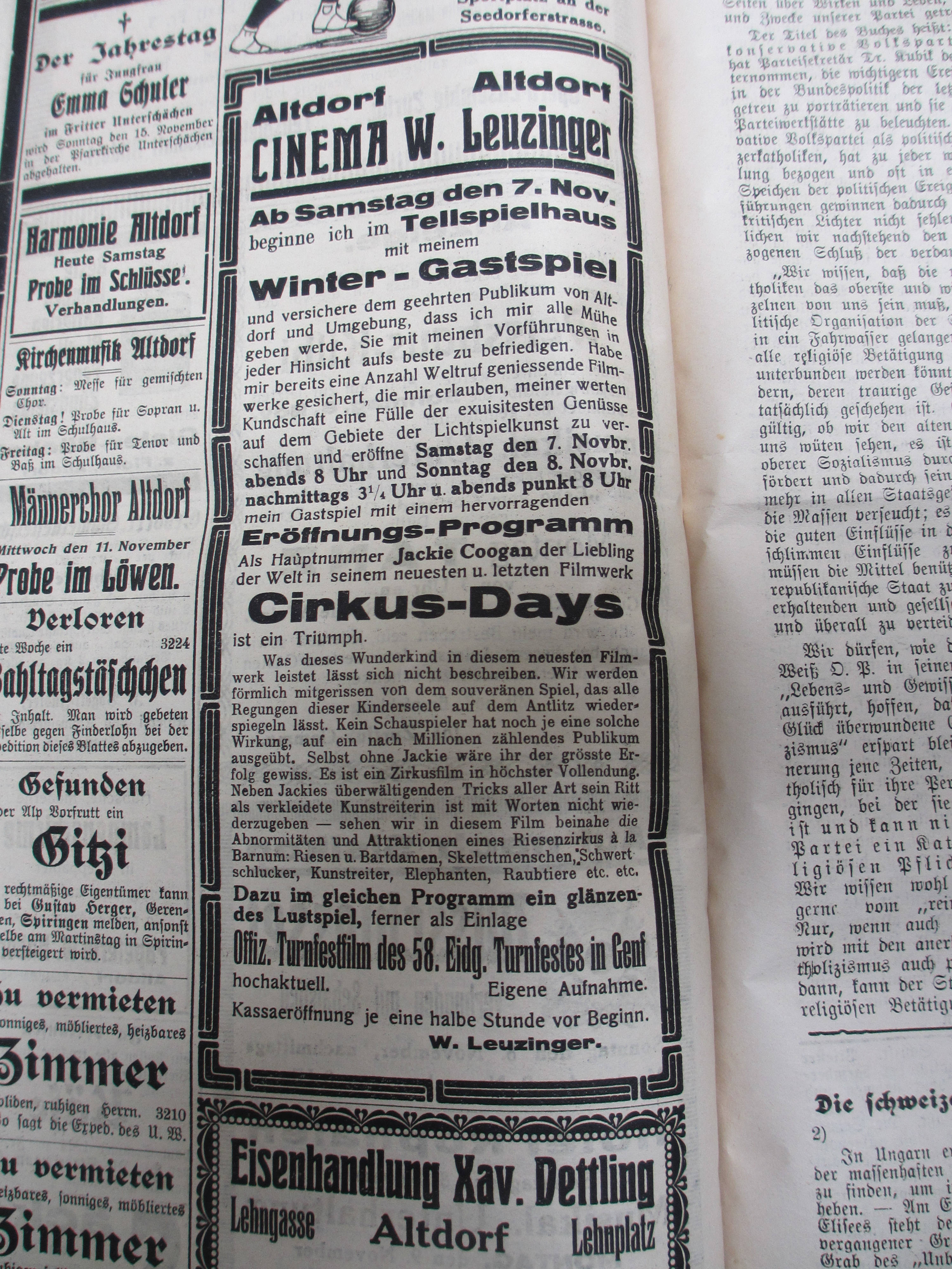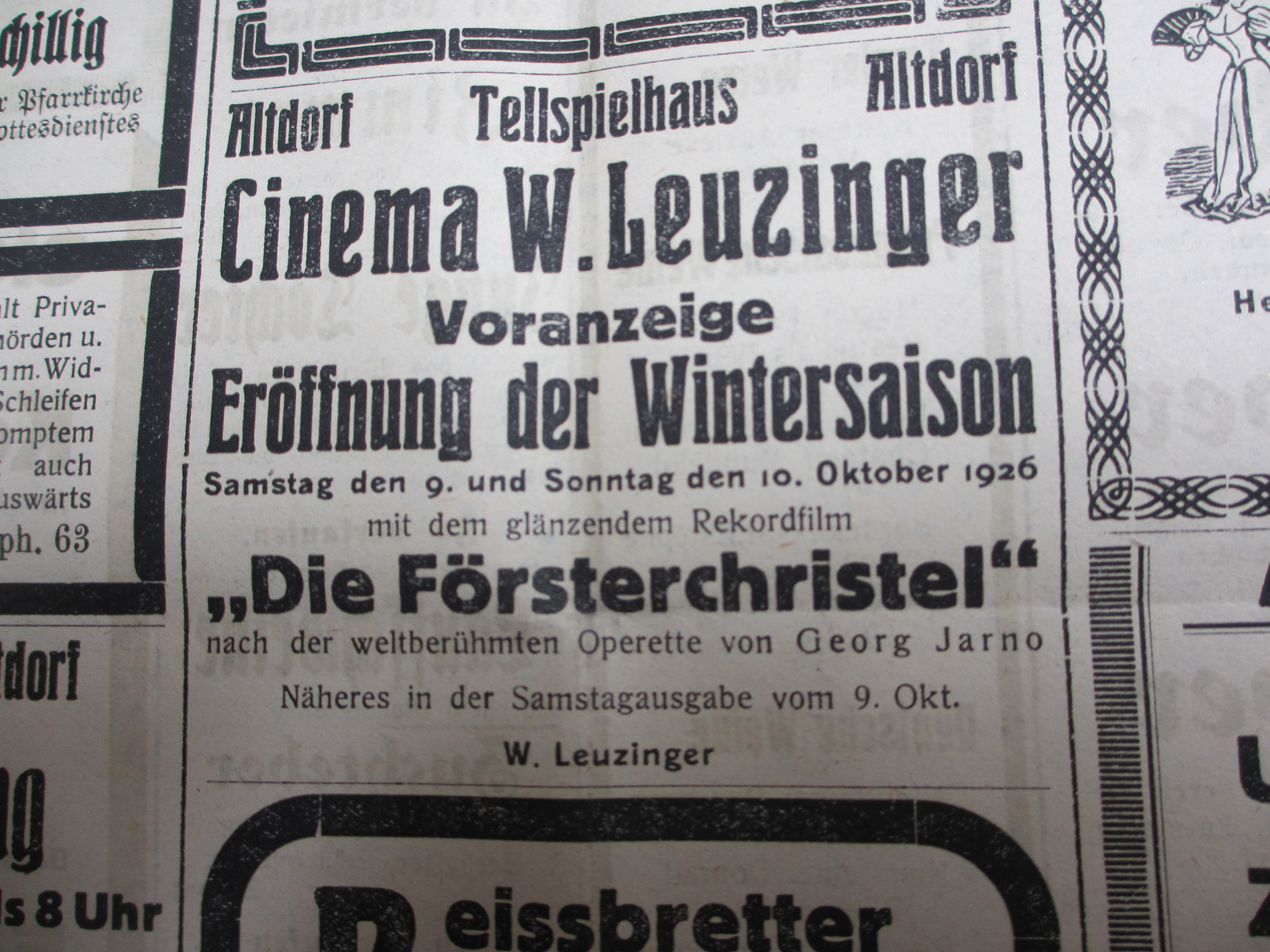 Am 07. November 1925 eröffnete Willy Leuzinger im Tellspielhaus das erste feste Kino im Kanton Uri mit Jackie Coogan, dem Liebling der Welt in seinen neuesten und letzten Film «CIRCUS DAYS». Als Vorprogramm zeigte er eigene Aufnahmen des 58. Eidgenössischen Turnfestes in Genf. Die Spielzeit dauerte ab November bis April jeweils am Wochenende. Seine Tochter Mathilde (1899-1980), welche das Unternehmen nach seinem Tode zusammen mit ihren Schwestern weiterführte, bewies gehörig Courage, als sie 1963/64 das elegante Lichtspieltheater – mit notabene stolzen 490 Plätzen (vor Renovierung) – in die urige Bergregion platzierte. Seit 1980 führt Willy Leuzingers Enkelin Marianne Hegi erfolgreich das Unternehmen. Mit der sanften Renovierung 2008 des im Denkmalregister eingetragenen Gebäudes (Digitalisierung / 3D, Erneuerung der Bestuhlung) sowie Umwandlung der ehemalige Garderobe in eine Bar, welche vor und nach den Vorführungen zum Verweilen einlädt, hat das Leuzinger erfolgreich auf die Kundenwünsche reagiert.