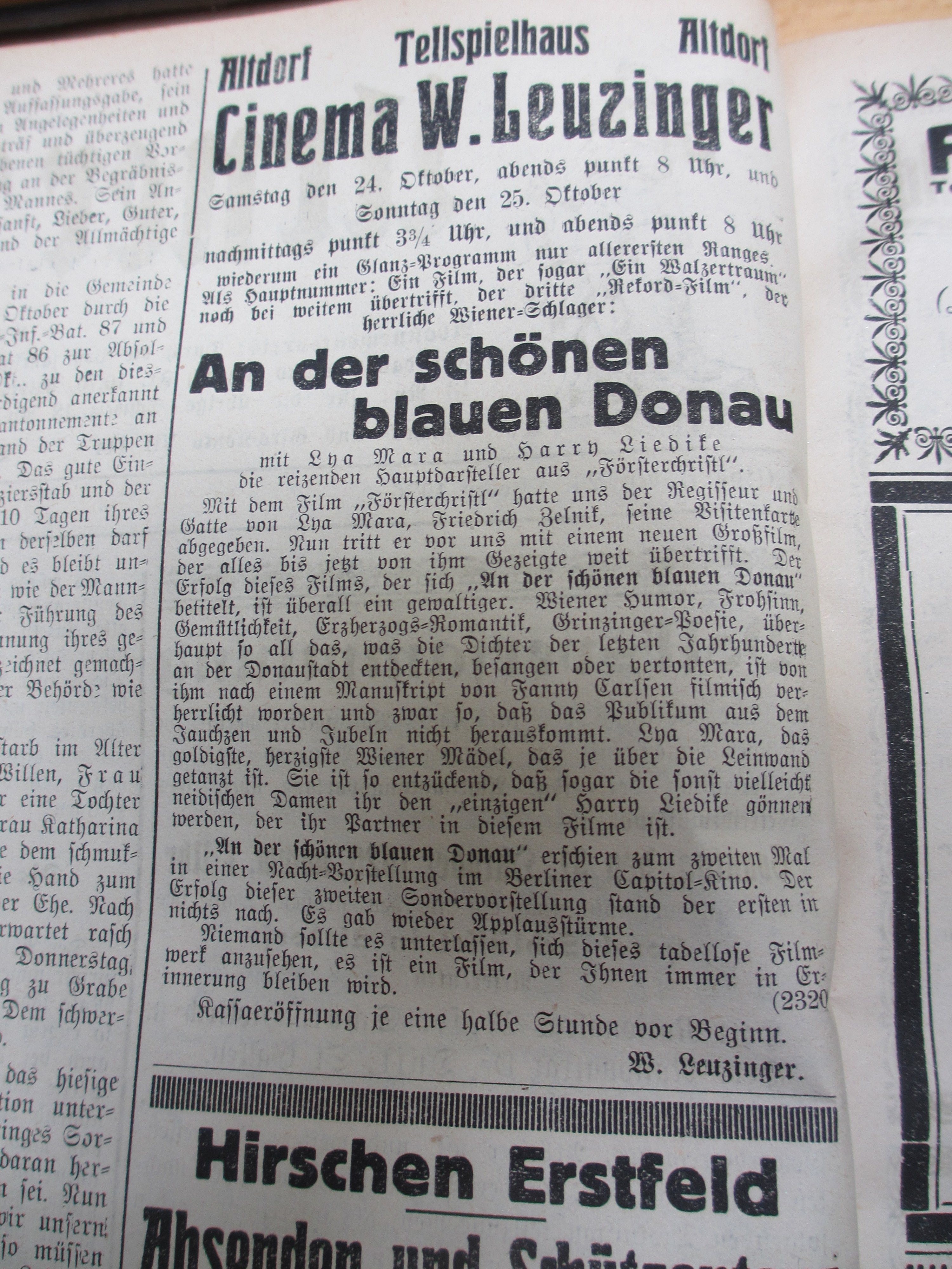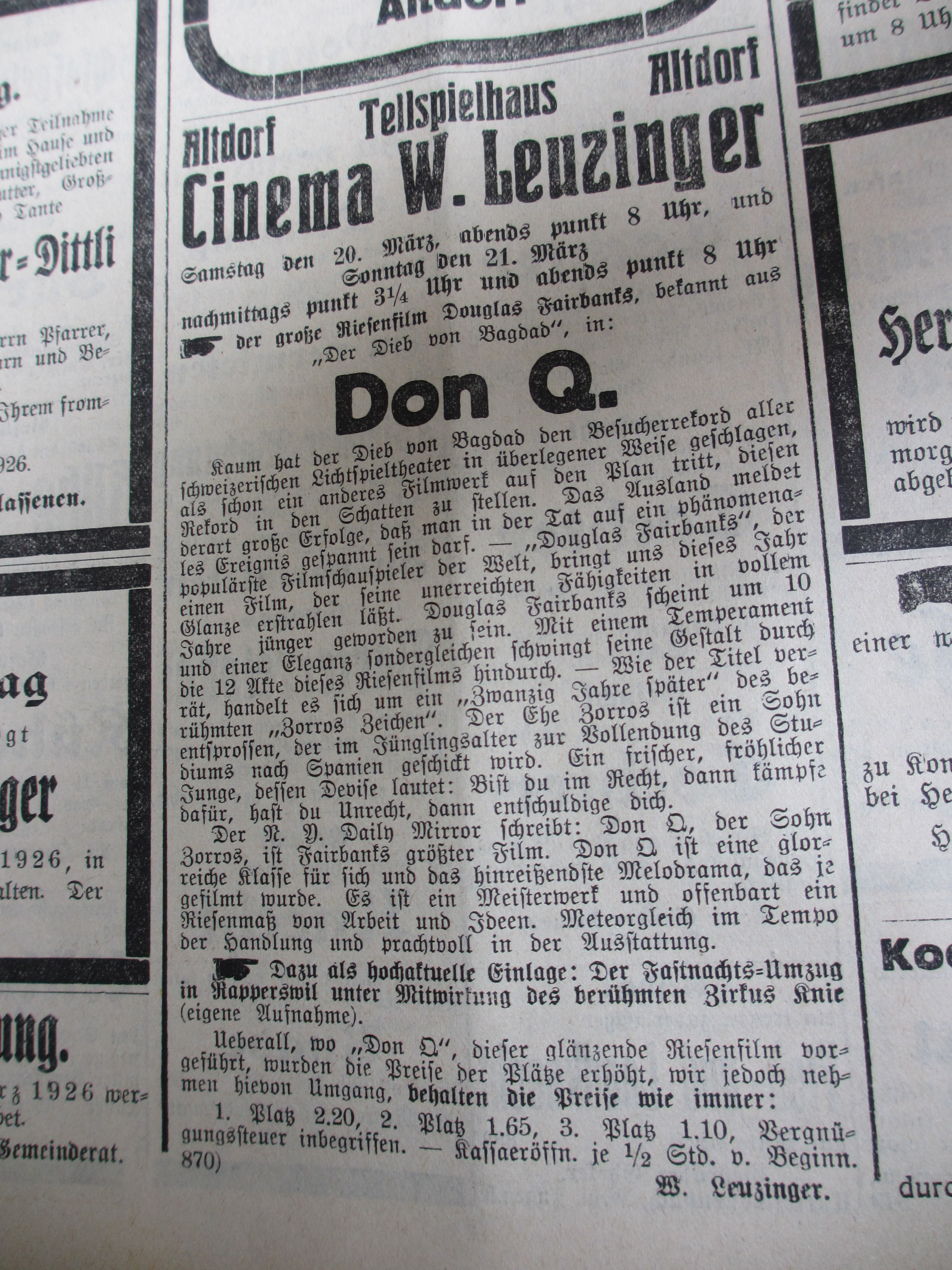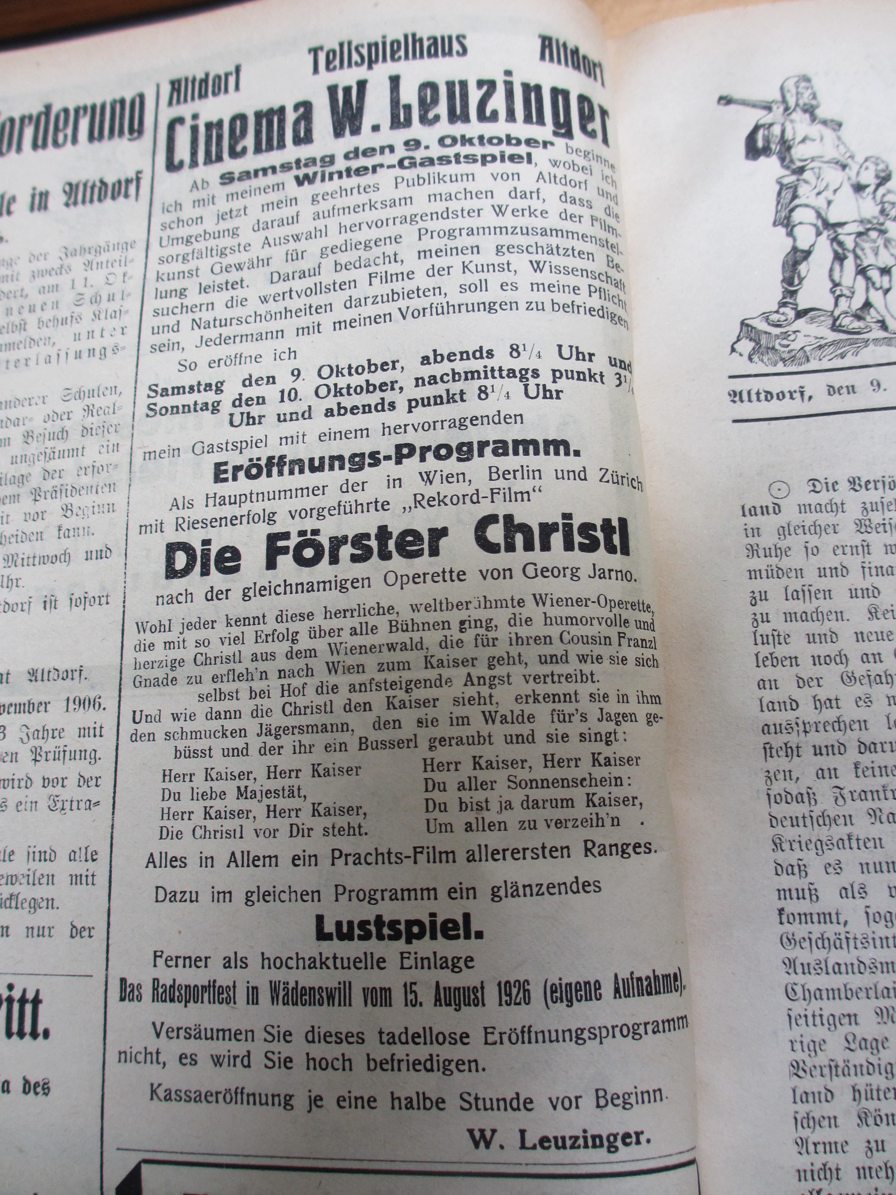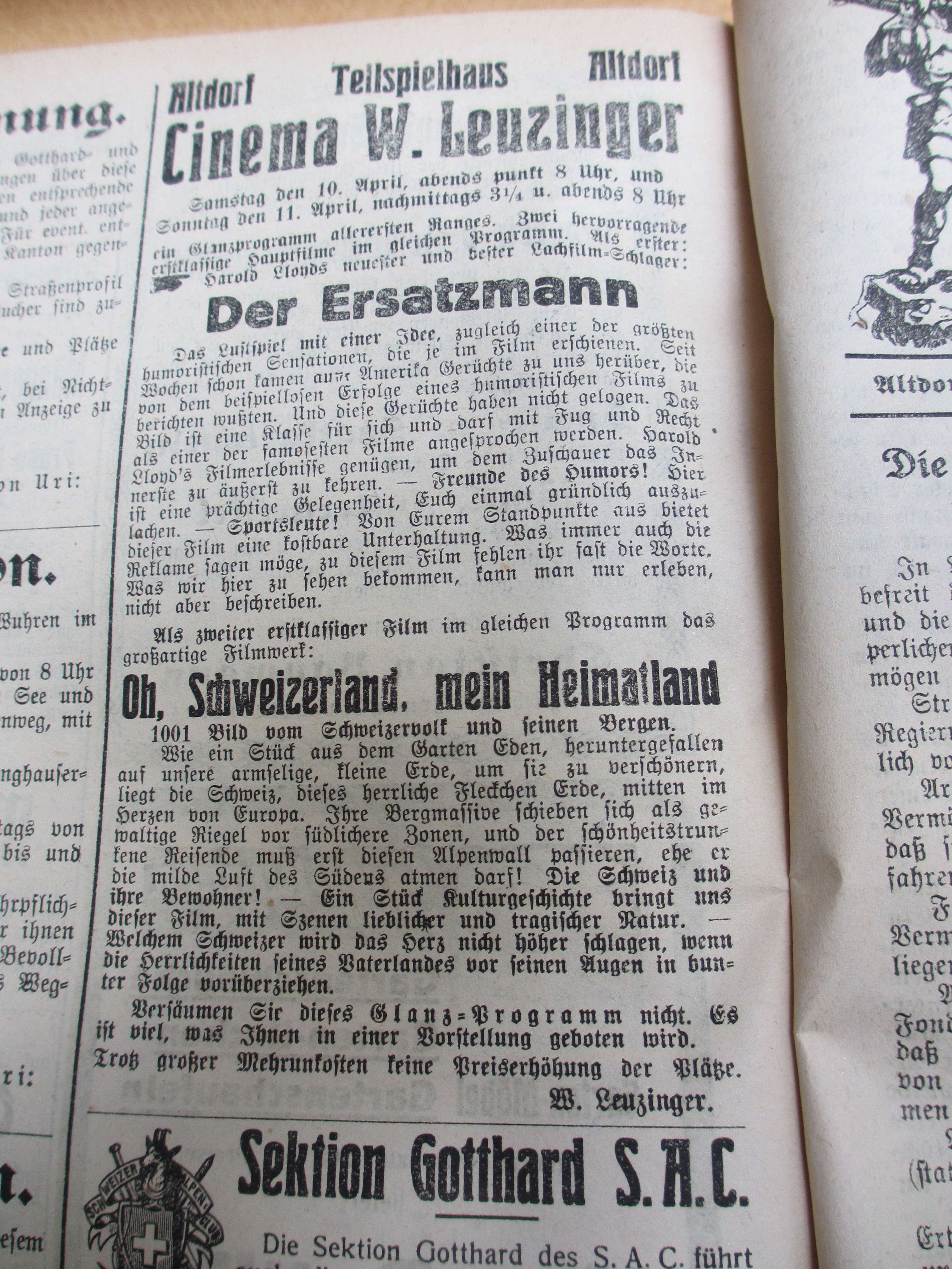 Am 07. November 1925 eröffnete Willy Leuzinger im Tellspielhaus das erste feste Kino im Kanton Uri mit Jackie Coogan, dem Liebling der Welt in seinen neuesten und letzten Film «CIRCUS DAYS». Als Vorprogramm zeigte er eigene Aufnahmen des 58. Eidgenössischen Turnfestes in Genf. Die Spielzeit dauerte ab November bis April jeweils am Wochenende. Seine Tochter Mathilde (1899-1980), welche das Unternehmen nach seinem Tode zusammen mit ihren Schwestern weiterführte, bewies gehörig Courage, als sie 1963/64 das elegante Lichtspieltheater – mit notabene stolzen 490 Plätzen (vor Renovierung) – in die urige Bergregion platzierte. Seit 1980 führt Willy Leuzingers Enkelin Marianne Hegi erfolgreich das Unternehmen. Mit der sanften Renovierung 2008 des im Denkmalregister eingetragenen Gebäudes (Digitalisierung / 3D, Erneuerung der Bestuhlung) sowie Umwandlung der ehemalige Garderobe in eine Bar, welche vor und nach den Vorführungen zum Verweilen einlädt, hat das Leuzinger erfolgreich auf die Kundenwünsche reagiert.