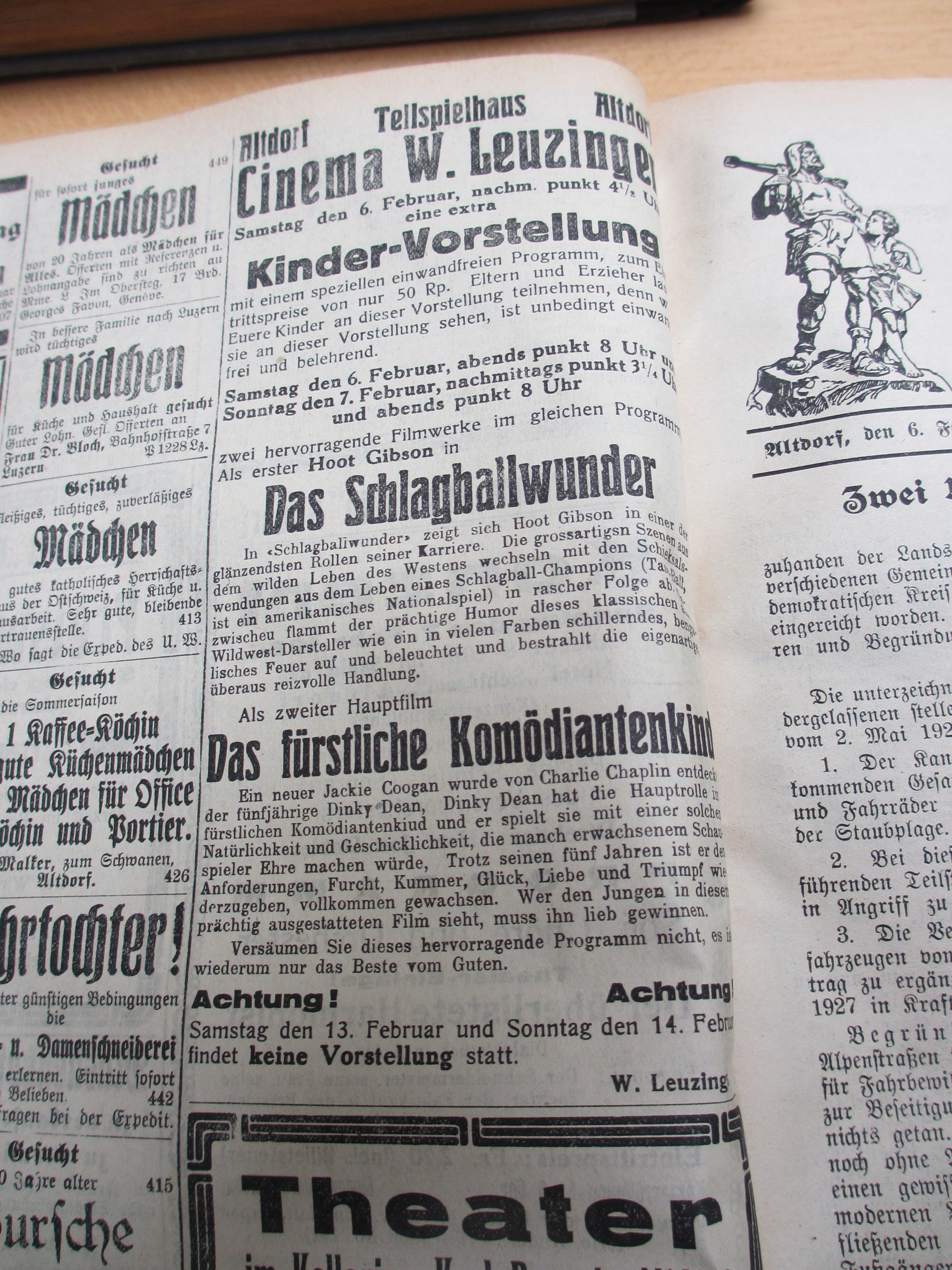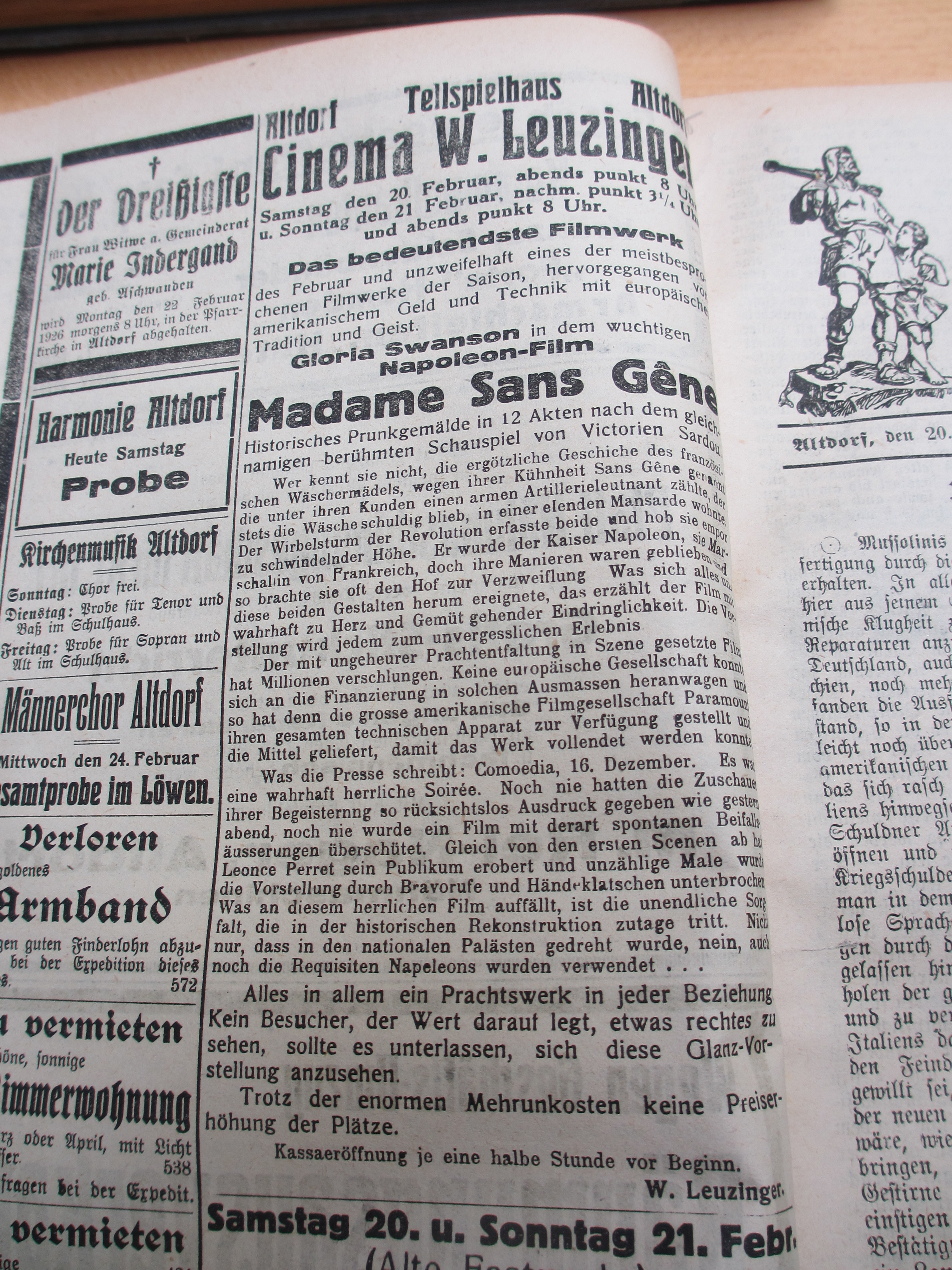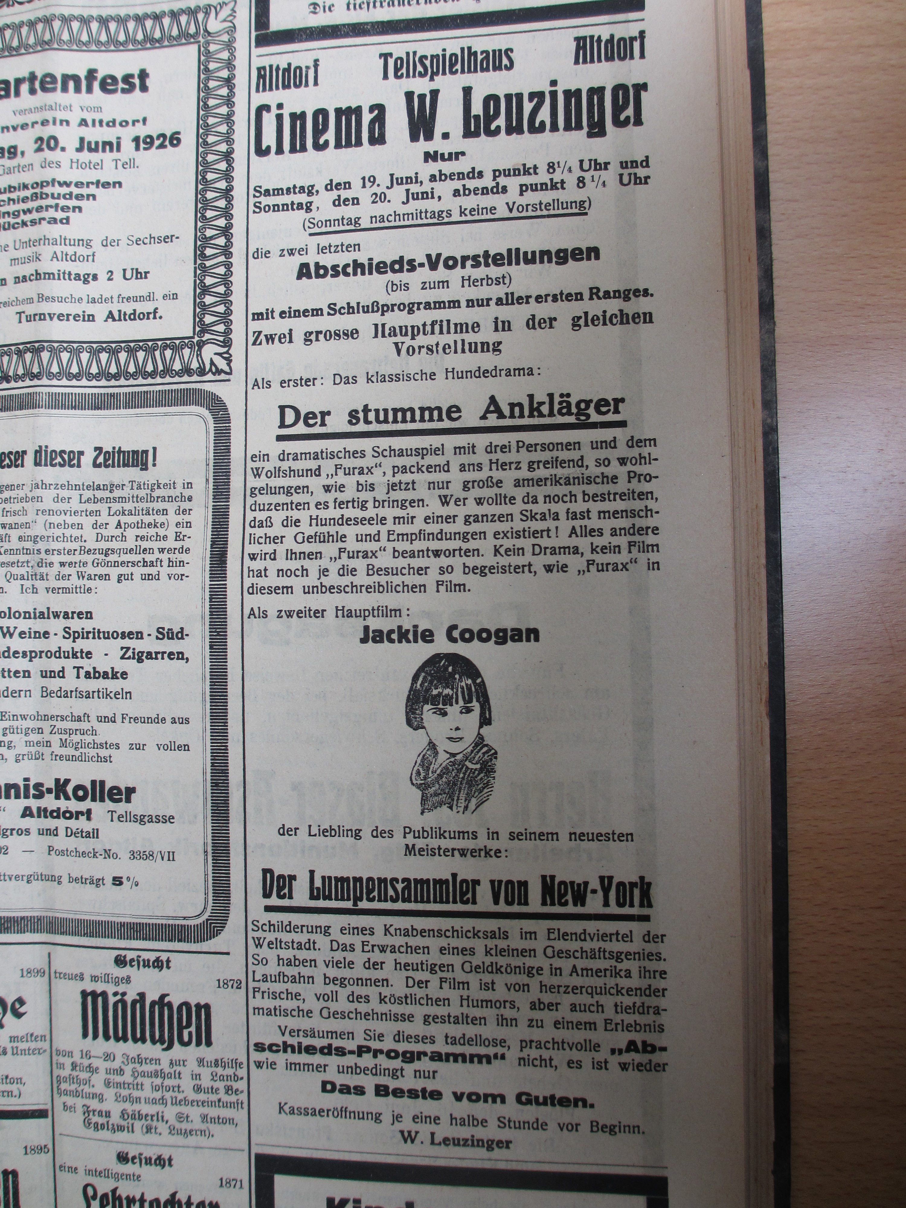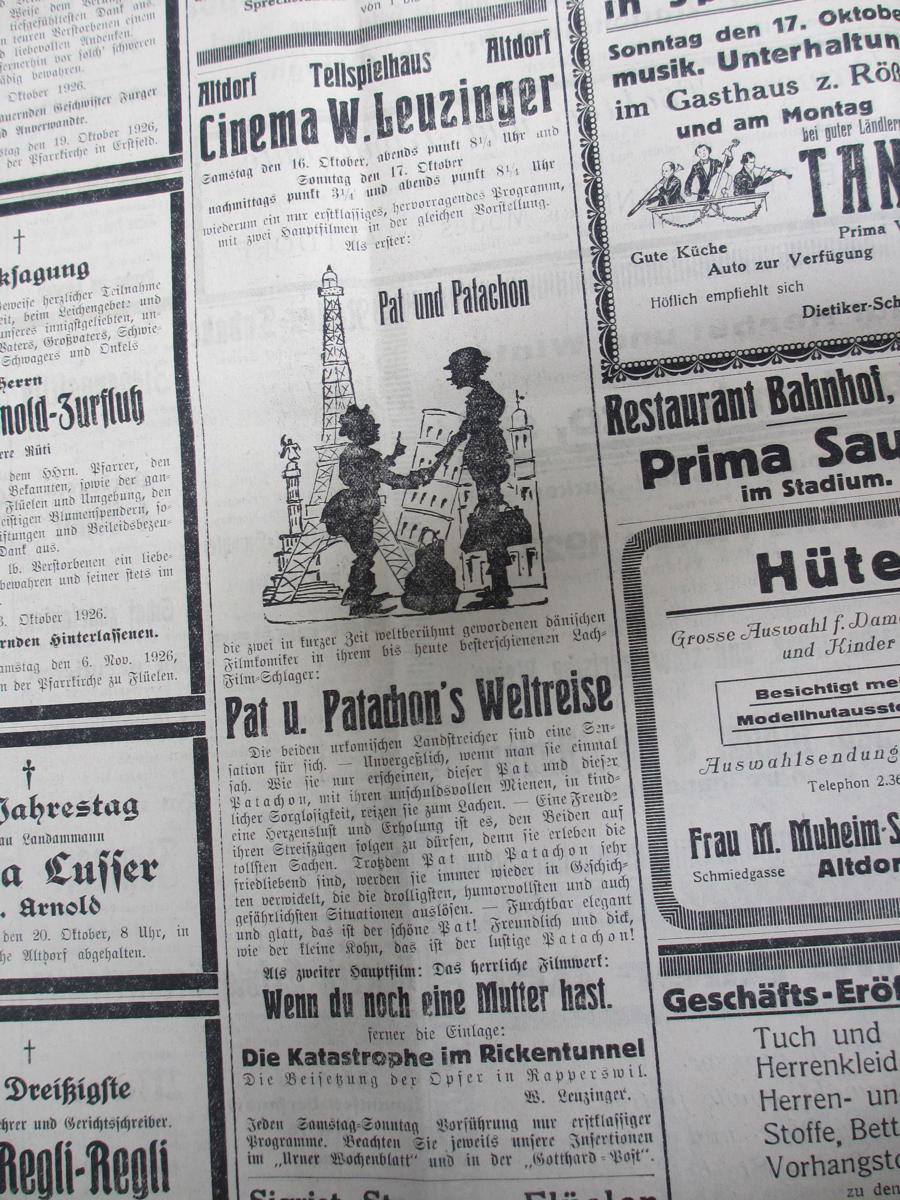 Am 07. November 1925 eröffnete Willy Leuzinger im Tellspielhaus das erste feste Kino im Kanton Uri mit Jackie Coogan, dem Liebling der Welt in seinen neuesten und letzten Film «CIRCUS DAYS». Als Vorprogramm zeigte er eigene Aufnahmen des 58. Eidgenössischen Turnfestes in Genf. Die Spielzeit dauerte ab November bis April jeweils am Wochenende. Seine Tochter Mathilde (1899-1980), welche das Unternehmen nach seinem Tode zusammen mit ihren Schwestern weiterführte, bewies gehörig Courage, als sie 1963/64 das elegante Lichtspieltheater – mit notabene stolzen 490 Plätzen (vor Renovierung) – in die urige Bergregion platzierte. Seit 1980 führt Willy Leuzingers Enkelin Marianne Hegi erfolgreich das Unternehmen. Mit der sanften Renovierung 2008 des im Denkmalregister eingetragenen Gebäudes (Digitalisierung / 3D, Erneuerung der Bestuhlung) sowie Umwandlung der ehemalige Garderobe in eine Bar, welche vor und nach den Vorführungen zum Verweilen einlädt, hat das Leuzinger erfolgreich auf die Kundenwünsche reagiert.